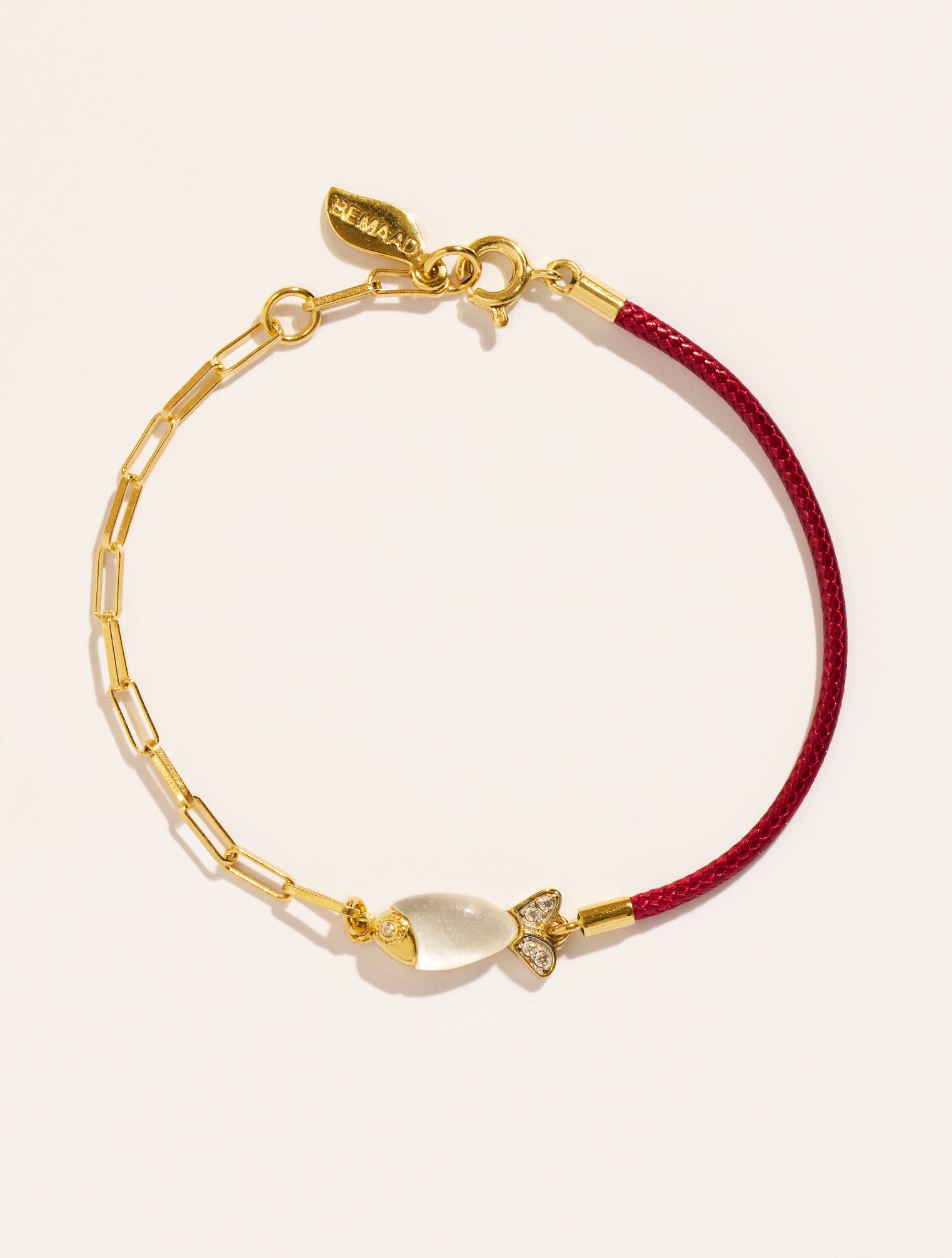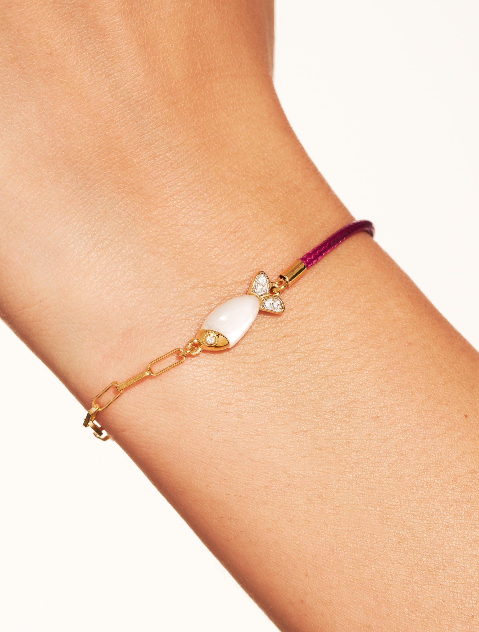 Associant chaîne fine et cordon soyeux coloré, le bracelet bi-matière Soleil Sauvage réinvente les symboles marins avec modernité. Coquillage, poisson et crabe se métamorphosent en pendentifs chics et graphiques, capturant l’essence de la nature avec une élégance inattendue. Loin d’être réservé à l’été, ce bijou est fait pour vivre sur votre poignet toute l’année.