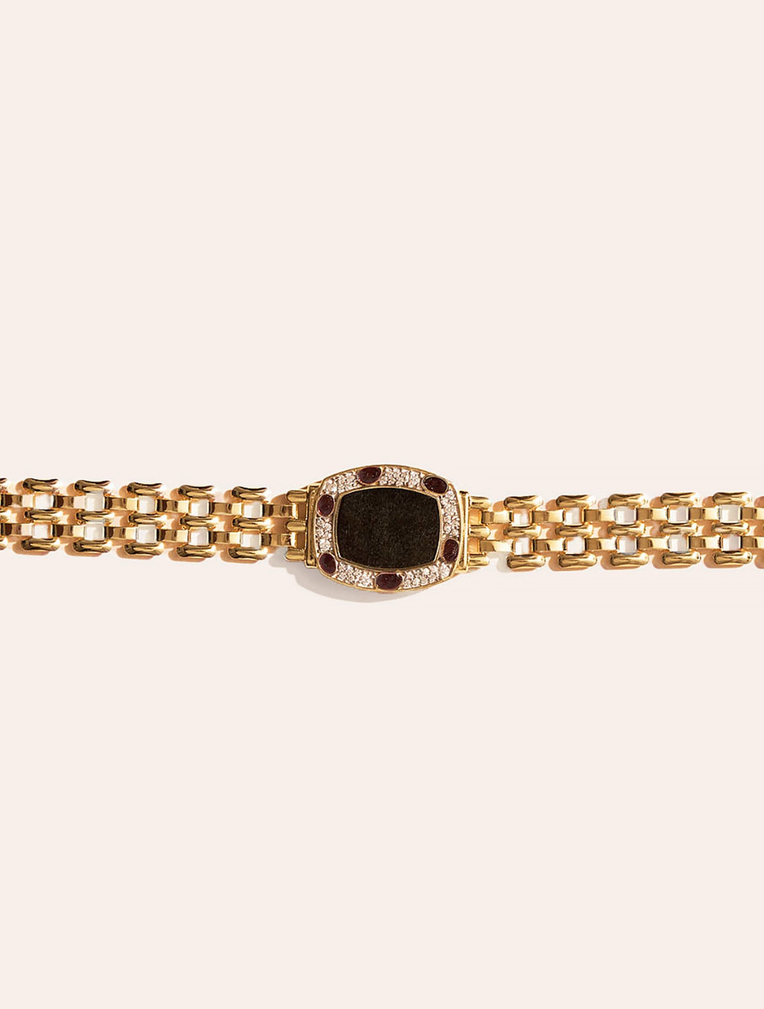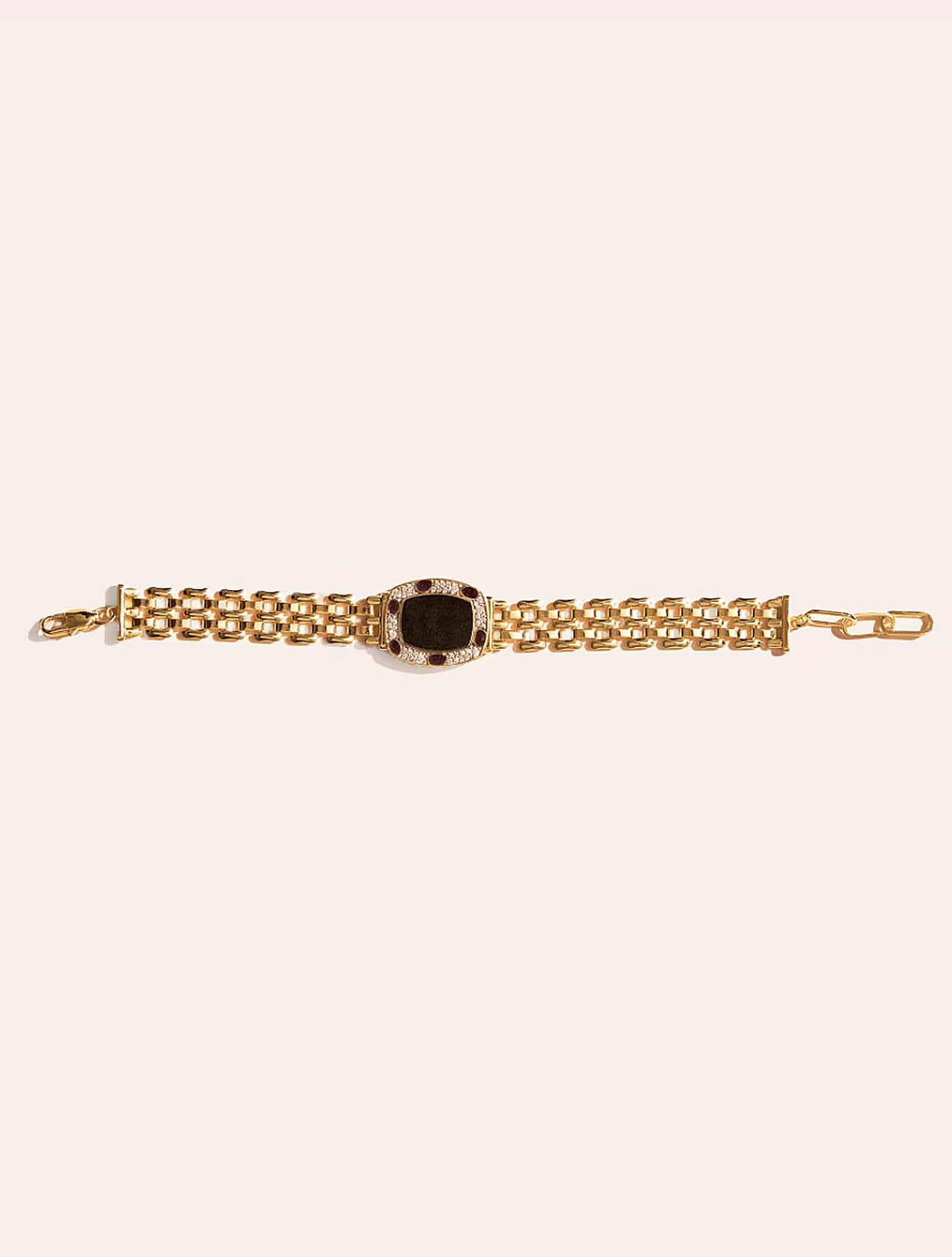 Un brin sauvage, le bracelet Ranee en obsidienne dorée entremêle l’histoire du passé à celle du présent. Miroir des codes de la montre vintage, il lui emprunte sa souplesse et sa classe, tout en y invitant un fragment de modernité.