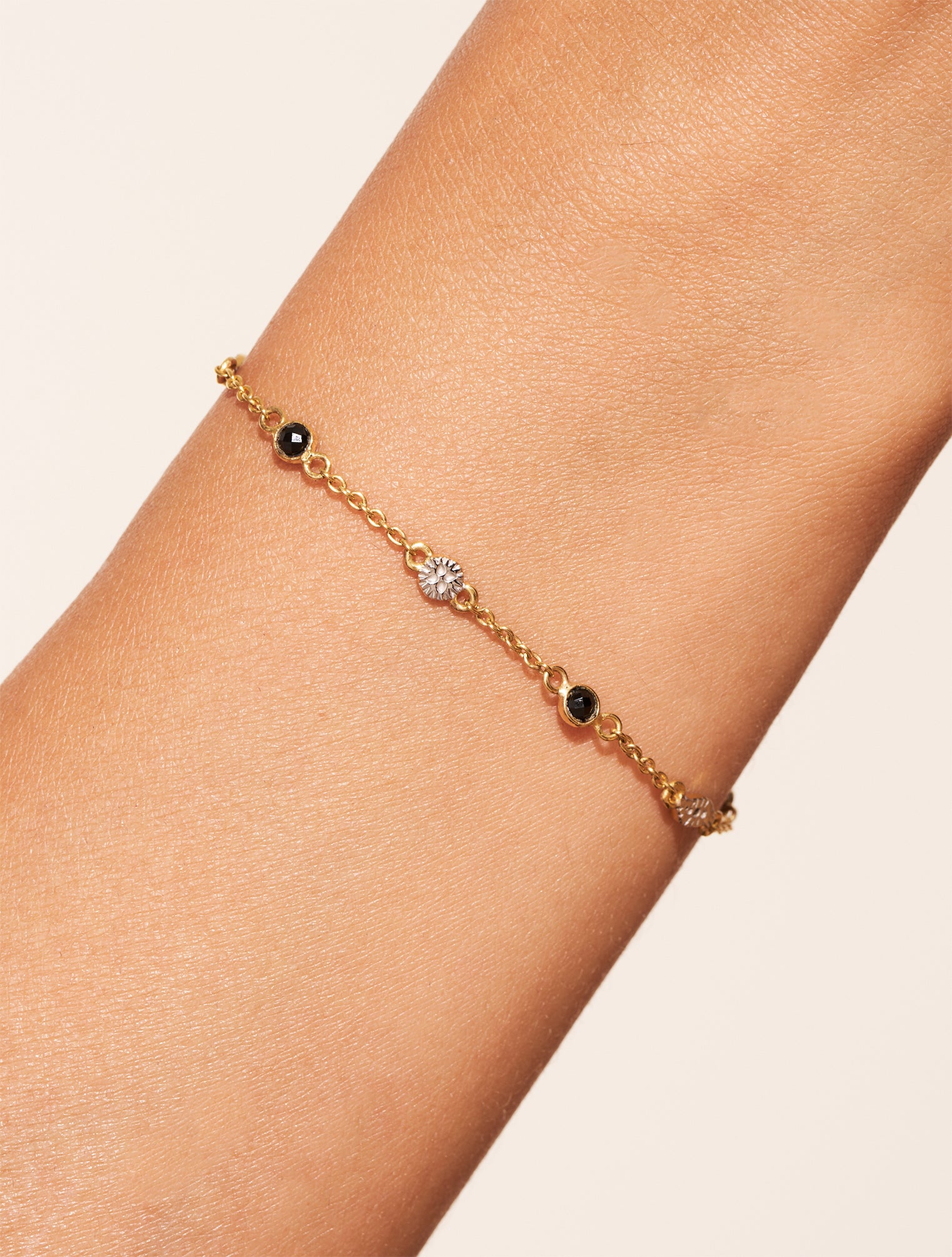 Le bracelet Sitara en Zircon Noir fin et intemporel, se caractérise par un contraste délicat entre l'or et l'argent. Une fois adopté, il ne vous quittera plus.