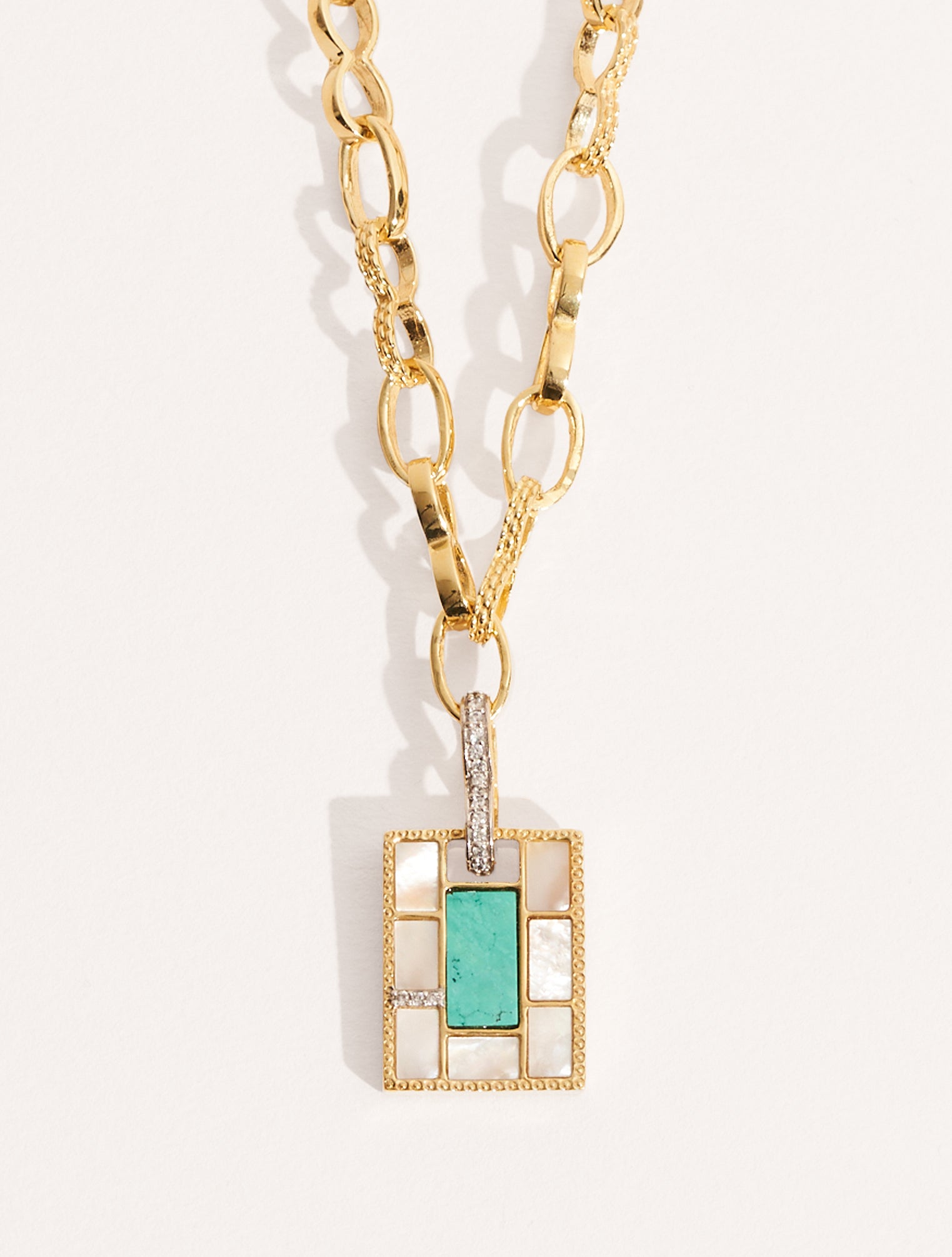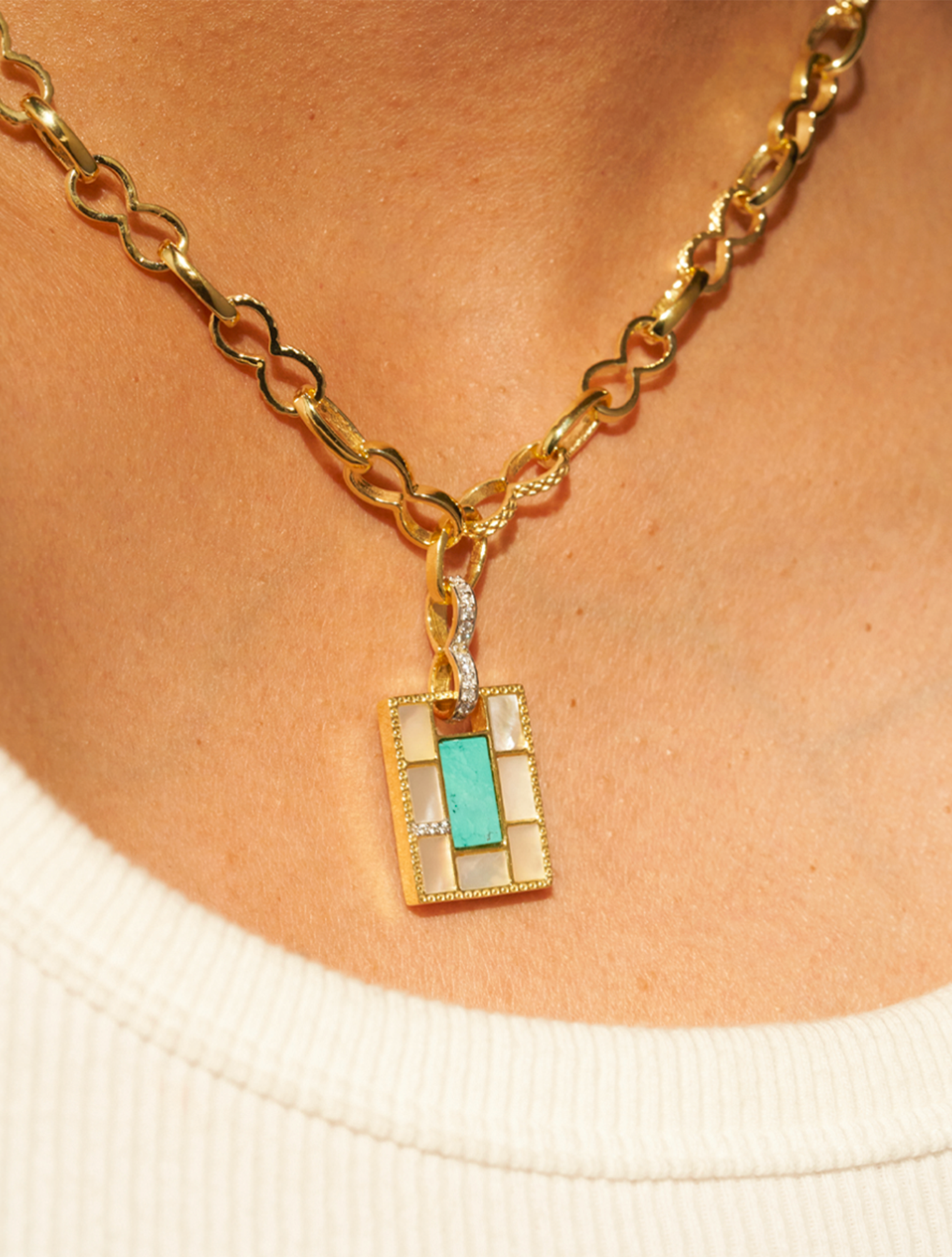 Doté d’une réelle originalité, c’est sur sa fine chaîne dorée qu’il suspend un pendentif rectangulaire graphique, orné de pierres et de zircons, tous taillés à la main avec soin.