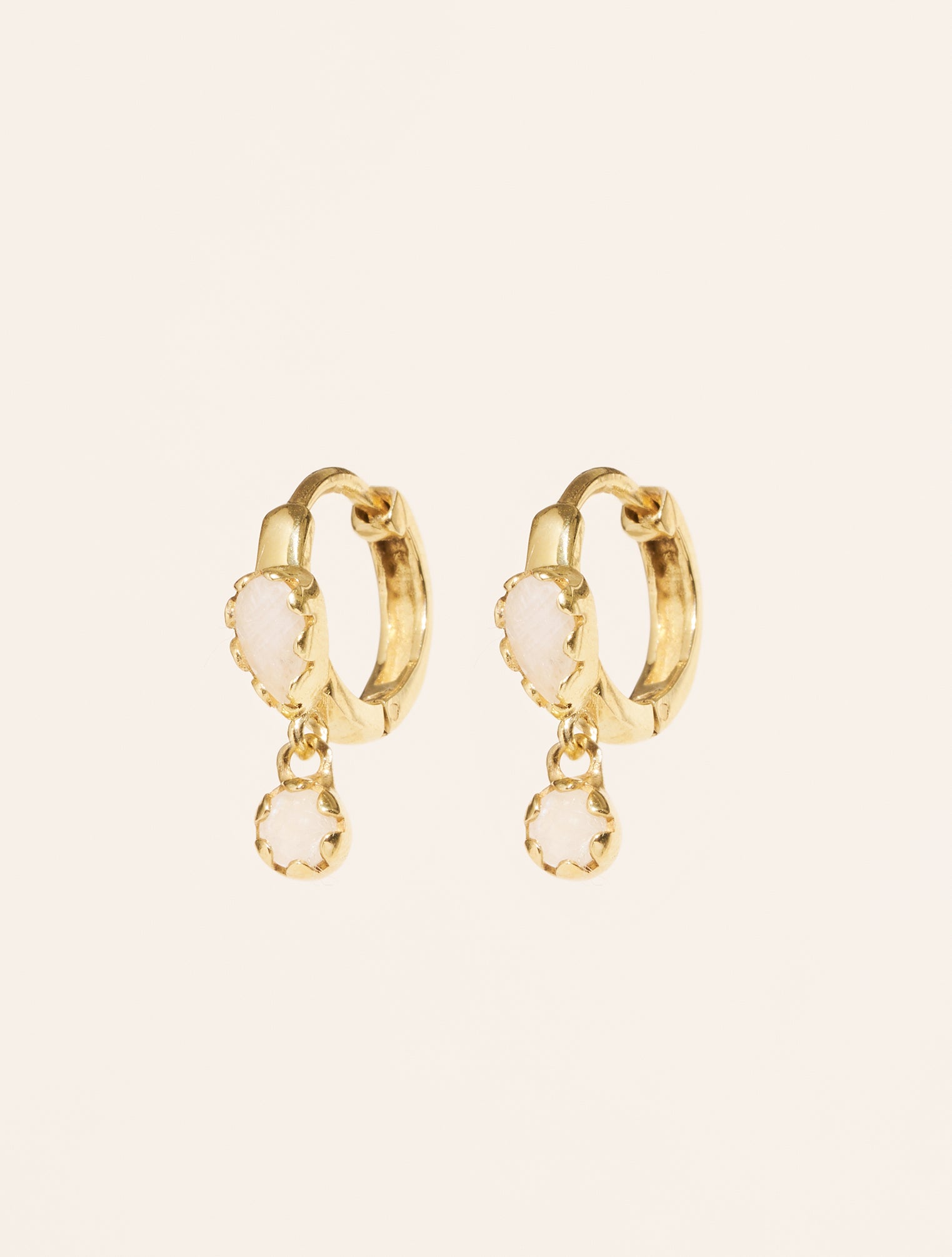 Légères et délicates, les mini créoles Safra deviendront un incontournable de vos bijoux du quotidien. Délicates et raffinées, elles ne vous quitteront plus de jour que de nuit. Ces créoles sont fabriquées à la main en laiton doré à l'or fin 18K et serties de pierre de lune.