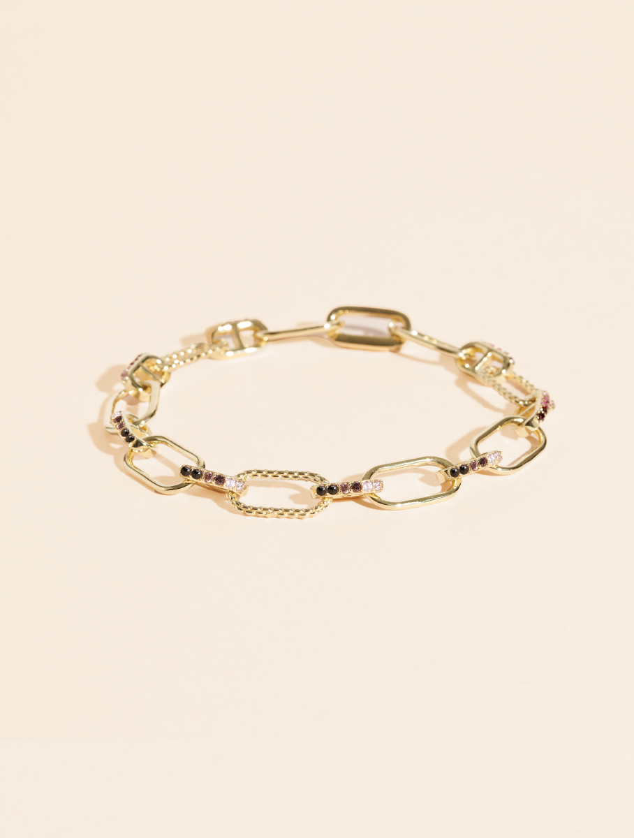 Pour un été haut en lumière, le bracelet Rheya en zircons noir sera le parfait compagnon ! Grâce à ses maillons vintage travaillés et ornés de zircons colorés, il va venir ensoleiller vos tenues !