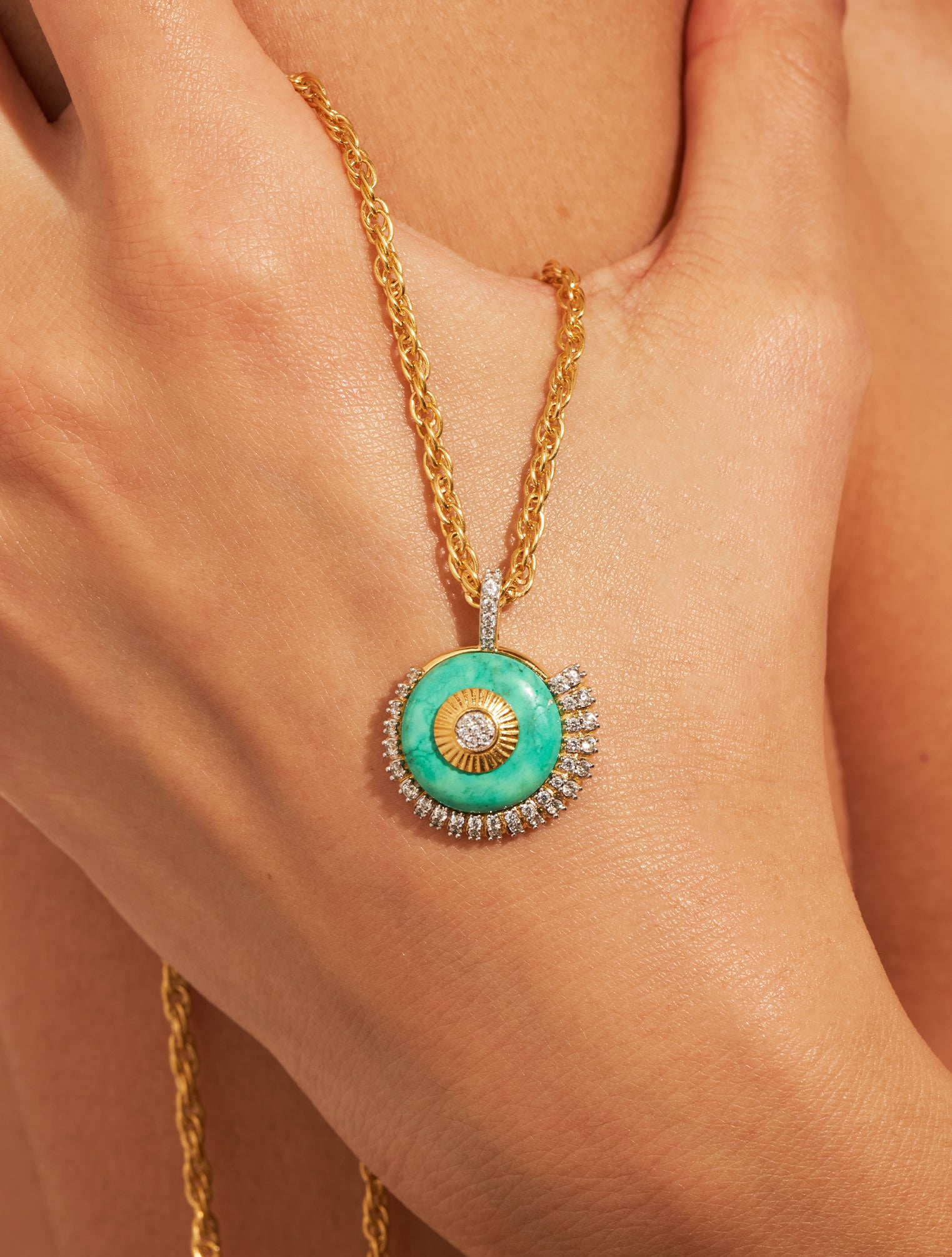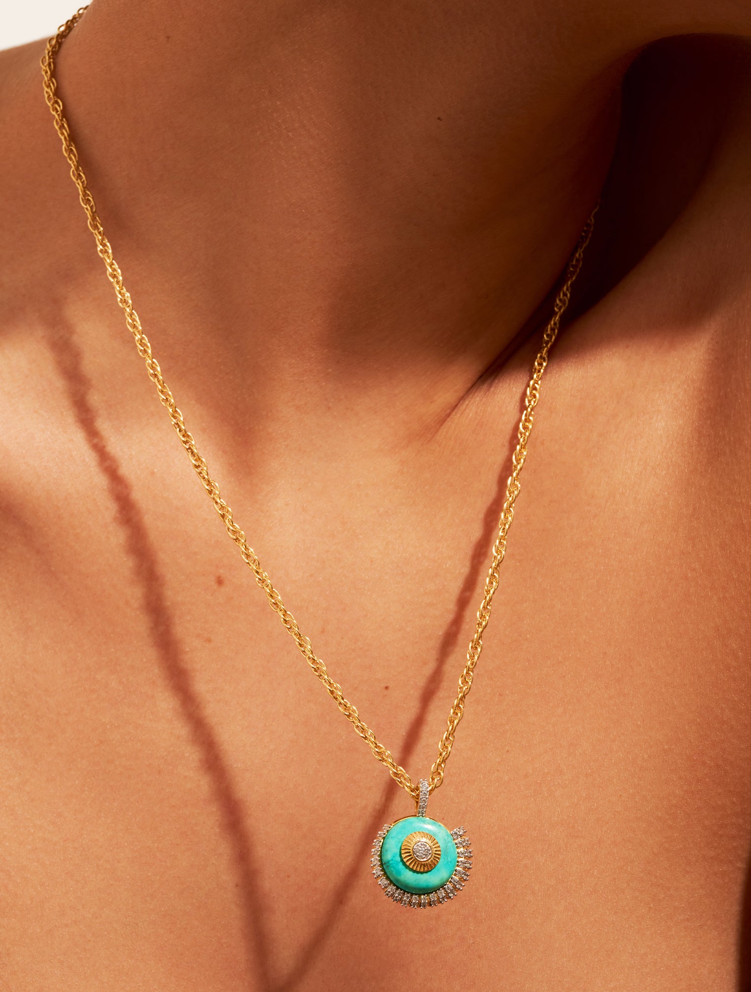 Le sautoir coquillage Soleil Sauvage en Turquoise bouscule élégamment les codes en mêlant sophistication et audace. Son pendentif en forme de coquillage, orné de pierres et de zircons, évoque la liberté et l’énergie du grand large. Un bijou aussi précieux que surprenant, où l’esprit ludique se conjugue à un savoir-faire minutieux.