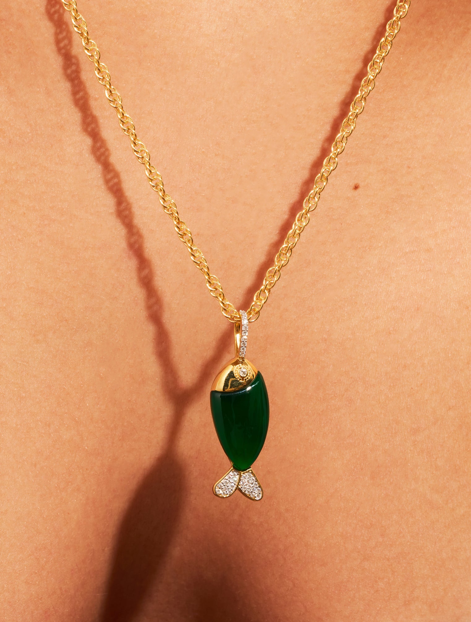 Quand l’océan devient bijou, le sautoir poisson Soleil Sauvage en Onyx vert célèbre son énergie brute et sa beauté insaisissable. Pensé comme un fragment de nature suspendu à une fine chaîne dorée, son pendentif poisson orné de pierres et de zircons scintille généreusement.