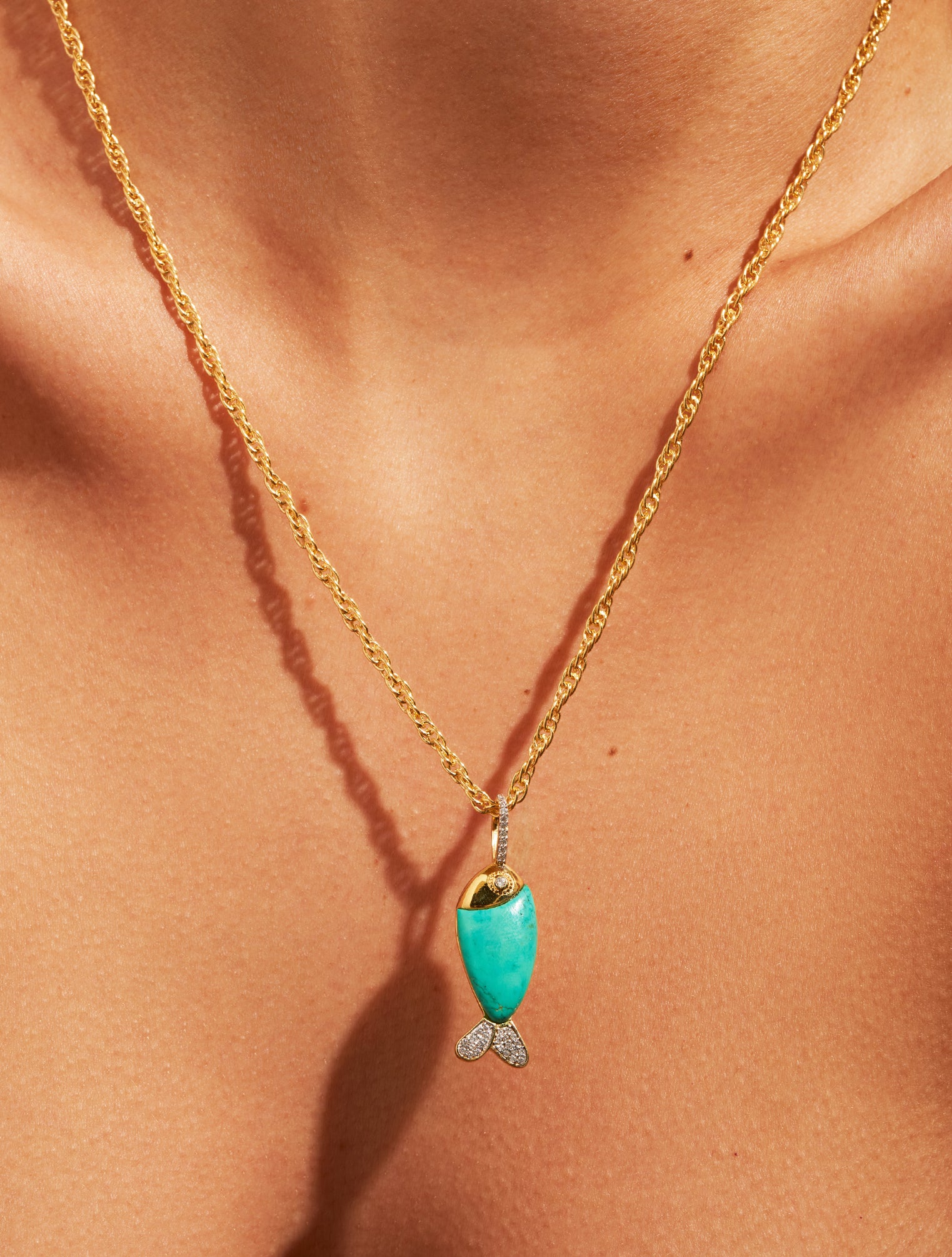 Quand l’océan devient bijou, le sautoir poisson Soleil Sauvage en Turquoise célèbre son énergie brute et sa beauté insaisissable. Pensé comme un fragment de nature suspendu à une fine chaîne dorée, son pendentif poisson orné de pierres et de zircons scintille généreusement.